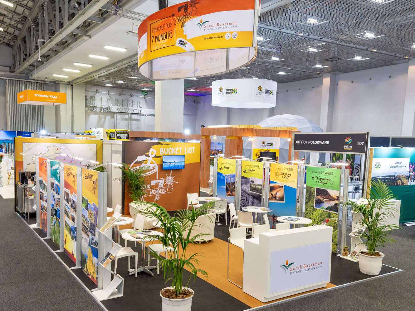 The Sarah Baartman Municipality stand (Best Large Green Stand – Silver) at World Travel Market Africa is a clear example of modular exhibition design. Its aluminium structure has been reused 23 times over 14 years at a variety of shows, with graphics replaced only twice. Retired graphics are repurposed in municipal offices, while shared transport, LED lighting, modular flooring, rental counters and locally sourced furniture reduce its environmental footprint.