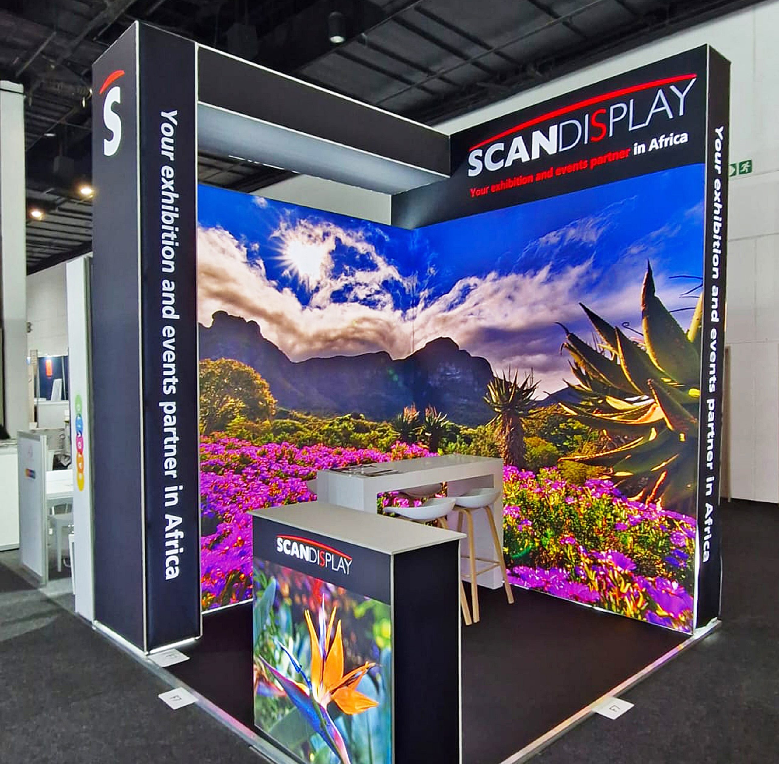 Scan Display’s own 3m × 3m stand (Best Small Green Stand – Bronze) at Meetings Africa shows that sustainable design works at any scale. Also a Fabric Pop-up Stand, it’s been in use at Meetings Africa since 2018. Its modular design and fabric graphics enable reconfiguration to maximise its ongoing reuse.